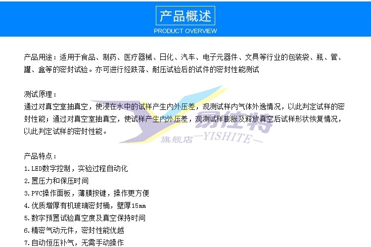 真(zhēn)空密封性能測(cè)試儀适用于食(shi)品、制藥、醫療器(qì)械、日化、汽車、電(diàn)⭐子元器件、文具(ju)等行業的包裝(zhuāng)袋、瓶、管、罐、盒等(deng)的密封試驗。亦(yì)可進行經跌落(luò)、耐壓試驗後的(de)試件的密封性(xing)能測試